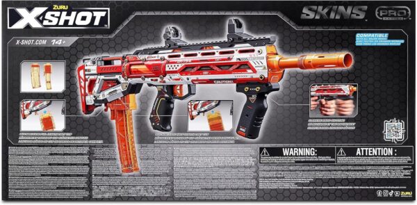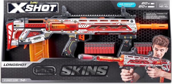 - Pack Inclusion: 1x X-Shot Skins Pro Series Longshot Blaster 2x Dart Clips 20x X-Shot Pro Series Half-Length Darts 20x X-Shot Pro Series Full-Length Darts