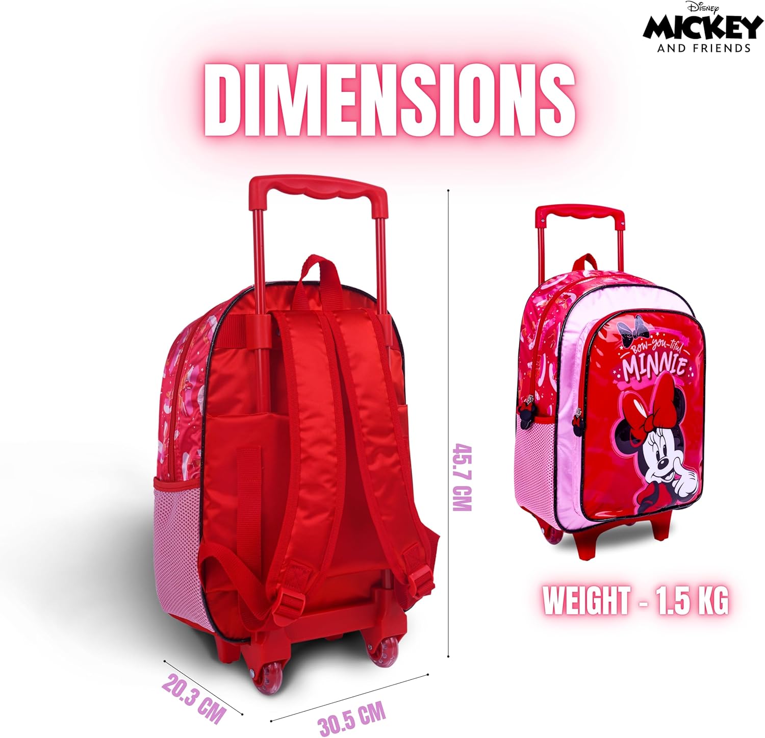 Disney Minnie Mouse 16 Inch Kids 3-in-1 Trolley School Bag Set - Ergonomic Backpack, Insulated Lunch Bag & Pencil Case,Lightweight, Students 6+ - Perfect for Travel & School,For Girls