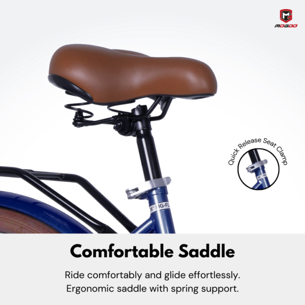 Turn sidewalks into runways with Mogoo Florida. The design places the seat a little farther back and with a lower center of gravity. That results in a more upright riding position with full leg extension This more upright riding position with raised handlebars eliminates wrist, arm, neck, and leg fatigue. You won’t believe the difference in how comfortable you feel while you ride!Frame: Steel