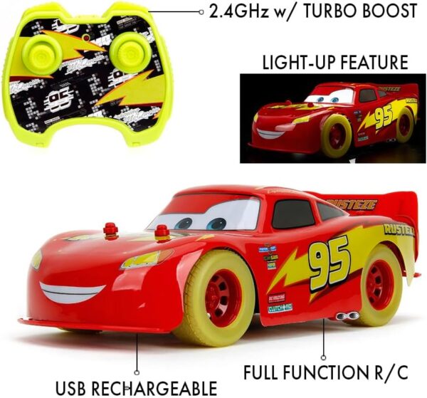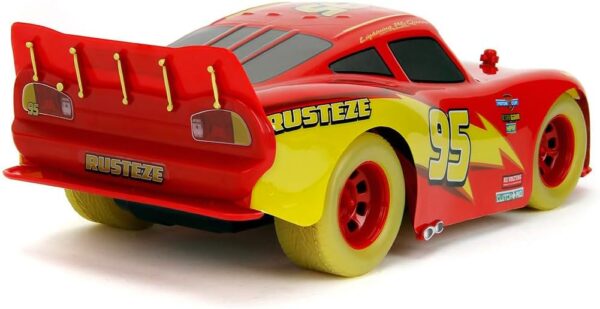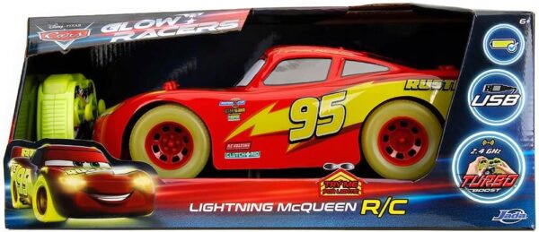 Experience high-speed fun with the Cars RC Glow Racer Lightning McQueen. Featuring underbody lighting and glow-in-the-dark stickers and tyres, this iconic red racing car comes alive in the dark. The 2.4 GHz remote control allows effortless steering and turbo speeds from 4.5 to 7 km/h. Perfect for kids 6 years and up, this officially licensed Disney Pixar model includes Lightning McQueen’s signature number 95 and Rust-eze lettering. Ready to play with built-in USB-rechargeable battery and included remote control batteries, this 1:24 scale car brings Hollywood movie magic straight into your home, crafted by Jada Toys.