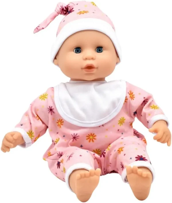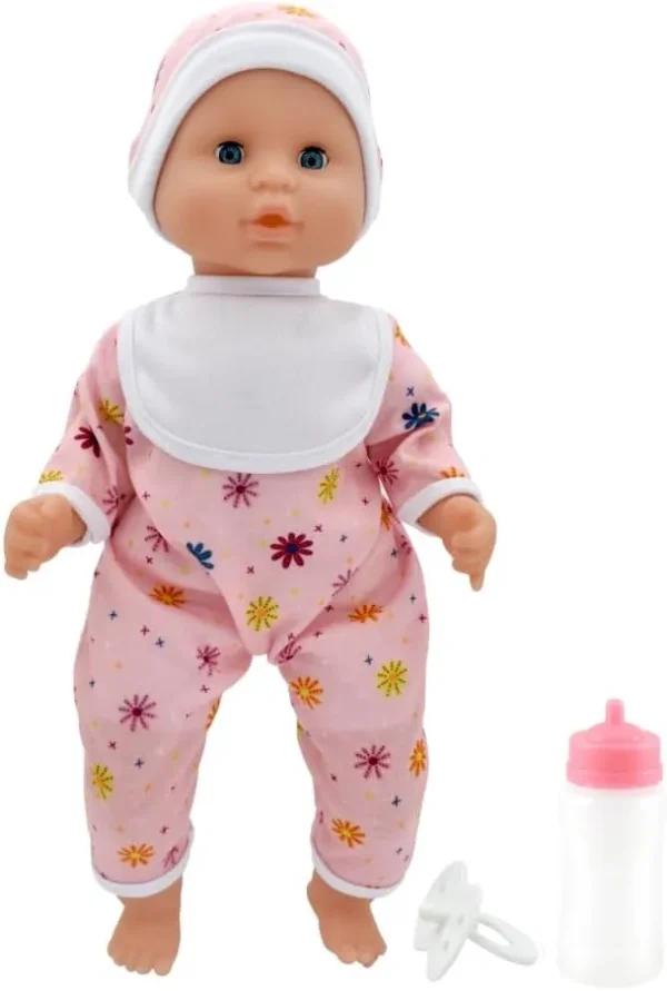 38cm (15″) baby with bean filled bum, sleeping eyes, deluxe romper, hat, bottle and dummy