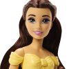 Posable Belle doll wears a floral fashion in her signature color, featuring a shiny removable skirt and shoes.