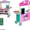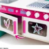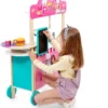 The chic Barbie-design restaurant for young restaurateurs is made out of sturdy wood. It features a barbecue, an oven, a refrigerator and a drinks dispenser. The accessories include a tablet that can be equipped with different cards. In addition to an interlocking burger and kebab skewer, the bistro equipment also includes a beverage cup, a spatula, a tray and a credit card.