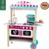 Hey, BBQ fans: in this bistro you will find everything your heart desires! Simply let the kebab or the burger patty sizzle imaginatively on the grill, bake the buns in the oven and prepare them according to the customers’ wishes. The only thing still missing is the drinks – little ones can choose between three different flavors here. Now, to make sure you get a good rating, quickly serve the treats to the hungry guests using the tray. The detachable wooden tablet can be fitted with different cards for you to take orders, pay and then rate the bistro. And if the guests want to find out what food is on offer, they can find the choices on the menu card or the chalkboard. Not only are role-playing games fun and enjoyable for little bistro owners, but they also also train their motor skills, communication skills and imagination.